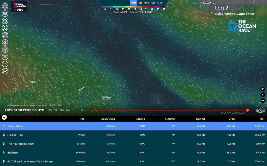 Incredibly, on Friday at noon UTC, the leading trio - Team Malizia, Team Holcim PRB and11th Hour Racing Team - are separated by less than 2.5 nautical miles on the advantage line as they drag race towards Cape Town on day 16 of the leg.