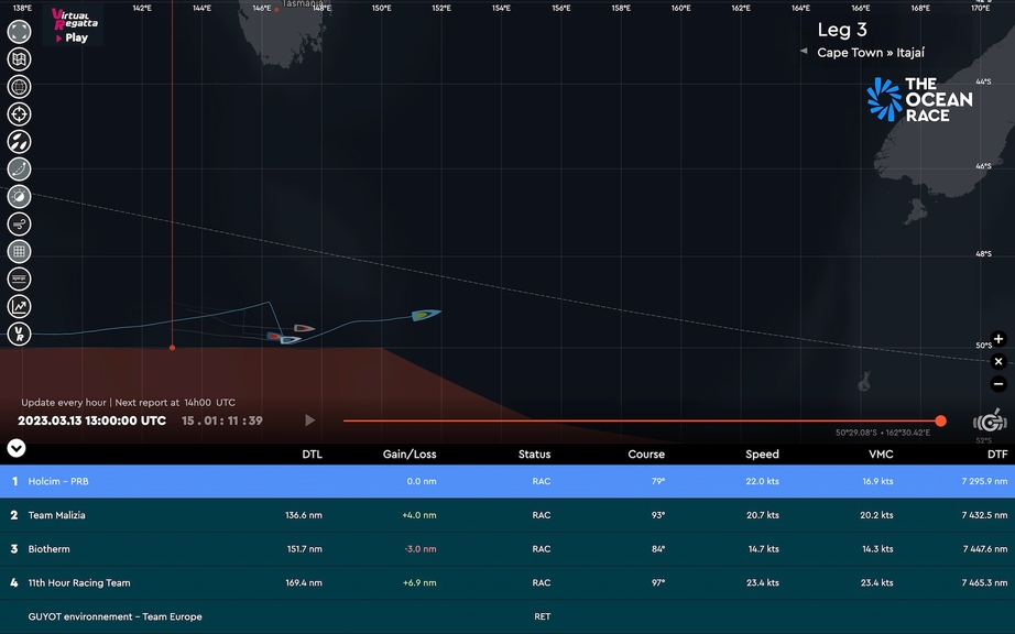 On Sunday evening UTC, Kevin Escoffier's Team Holcim-PRB would be first across the 143 degrees east longitude line, collecting another 5 points and expanding his lead on the points table.
