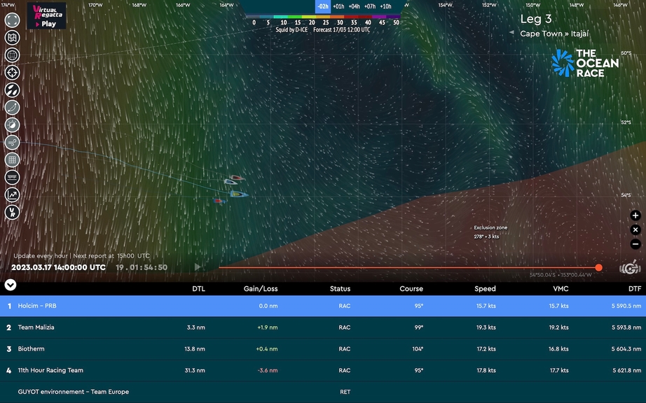 "It has been our plan to be in the north so we have the ability to come down at a good angle to the ice exclusion zone," said Nico Lunven on Team Malizia. "With this wind speed it is quite nice. But it is already getting a bit light closer to the high pressure."