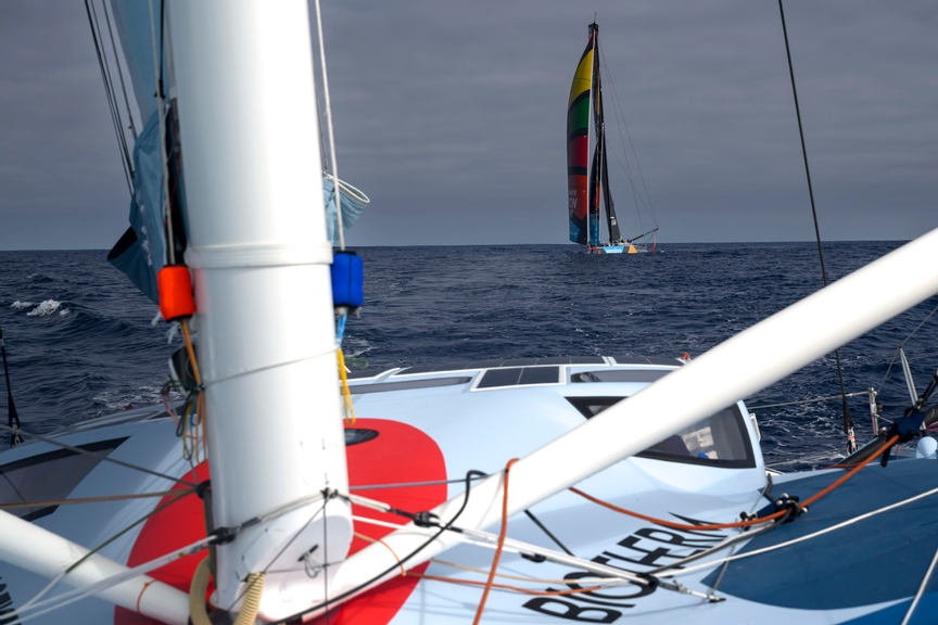 "There is a ridge of high pressure in front of us and a low pressure behind, so we are stuck a bit in the middle," is the way Biotherm skipper Paul Meilhat explains the situation.