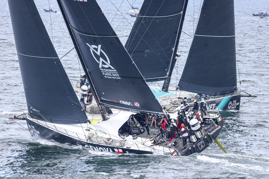 1815 local time -- We're racing!! Leg 7 - the Grand Finale to Genova is underway! It's a clean start. 11th Hour Racing Team is bow forward with speed on the line and Team Malizia to windward also with good pace.