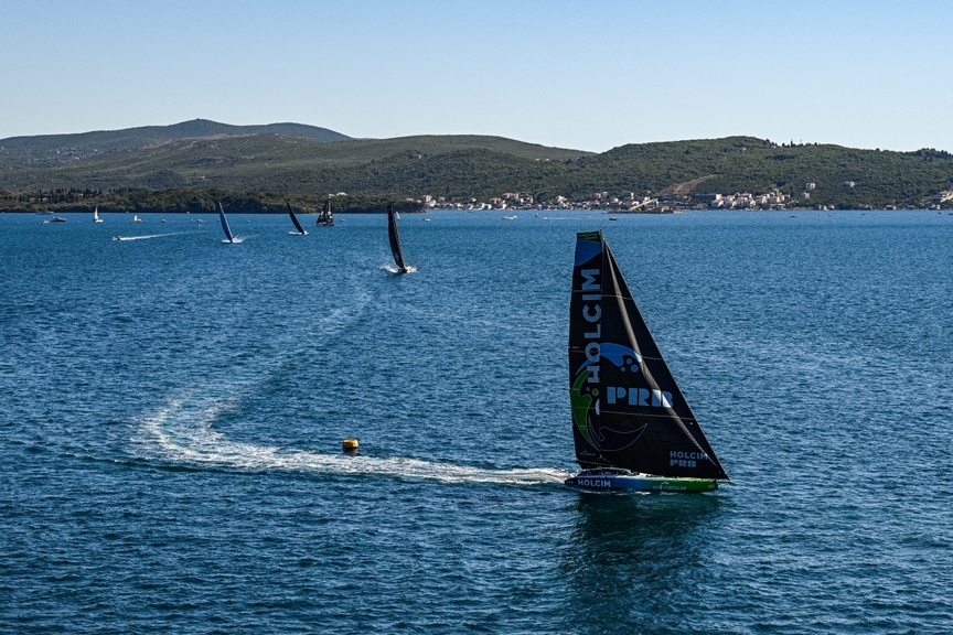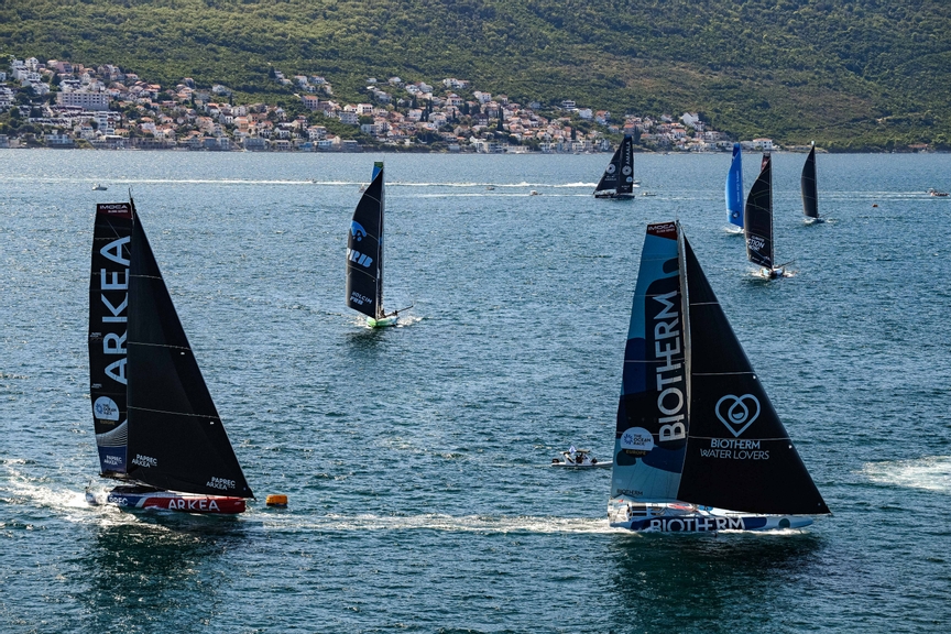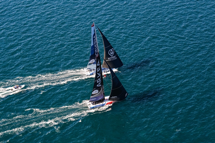 Dès le top départ, la bataille a redoublé d’intensité avec des conditions légèrement plus fortes que prévues (autour d’une dizaine de nœuds de vent). Paprec Arkéa a pris l’avantage à la première bouée puis à la seconde, imprimant le tempo en tête de course. Derrière, Holcim-PRB a été distancé suite à une manœuvre peu réussie et a dû s’employer pour revenir. Ce qui imprime alors la rétine des spectateurs, c’est de voir l’ensemble de la flotte, aligné entre les bouées.